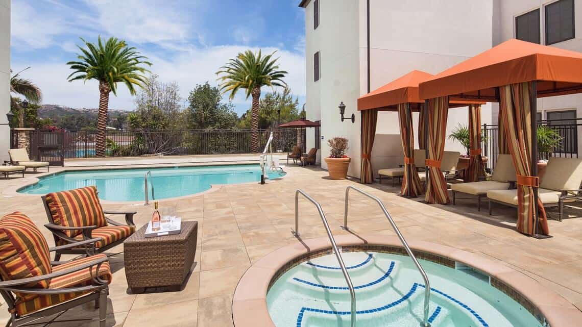 Outdoor pool and therapeutic hot tub at Crestavilla, an Atria Signature Residence, in Laguna Niguel, California