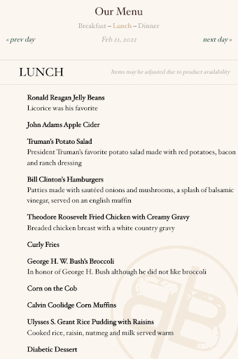 Themed Presidents Day menu at the Bickford of Presque Isle Bay. Source: Bickford Senior Living.