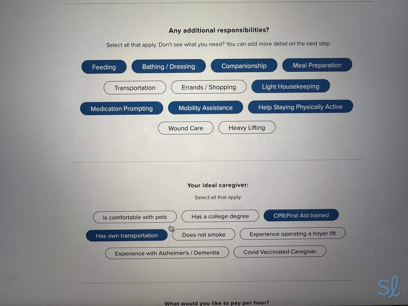 I was then asked to explain the type of care I was looking for — recurring, one-time, or live-in — and the days and times I needed care. The website showed the average pay in my area, and then asked what I was willing to pay. After that, I was asked to share details about who needed care — their gender, age, and other details about them. It also asked me to describe what I was looking for in a caregiver. If you forget to mention something, you can always edit your information in the Job Description section of your profile.