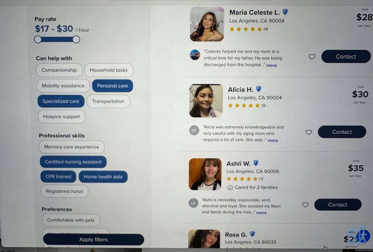Looking at the different options for caregivers in my area on Care.com