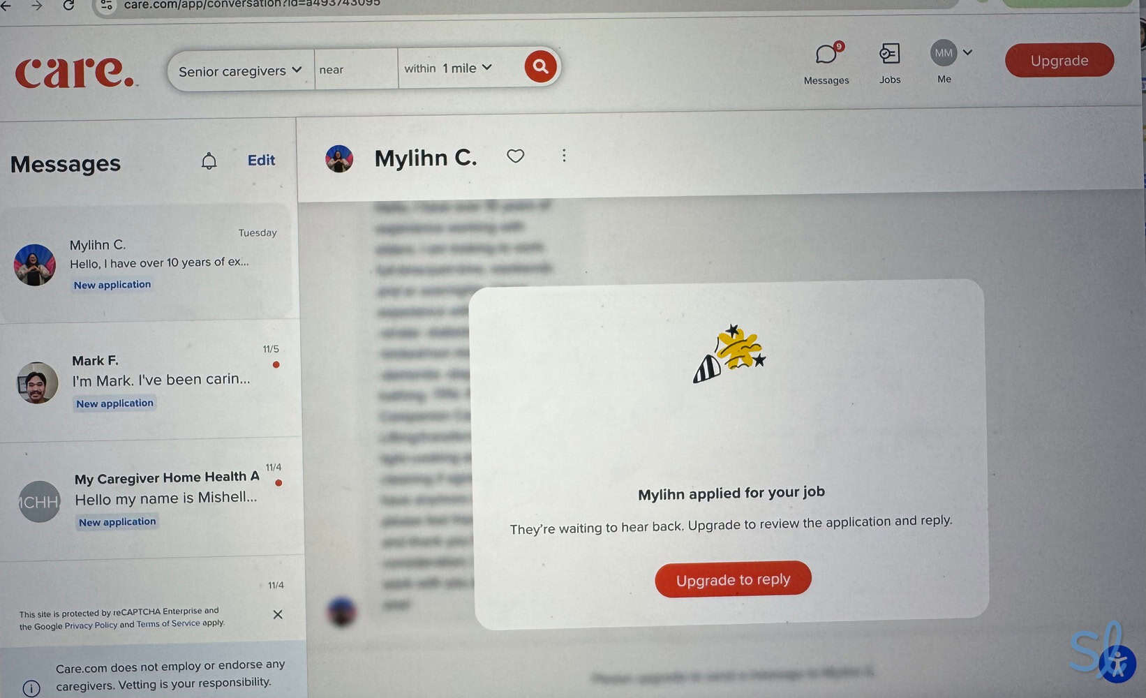 You can select either a paid premium membership or a free basic membership. A basic membership lets you search for caregivers, share your needs by posting a job, and get applications. But you can’t review applications or send messages to caregivers unless you upgrade to a paid premium membership. A premium membership allows you to access applications and contact caregivers.
