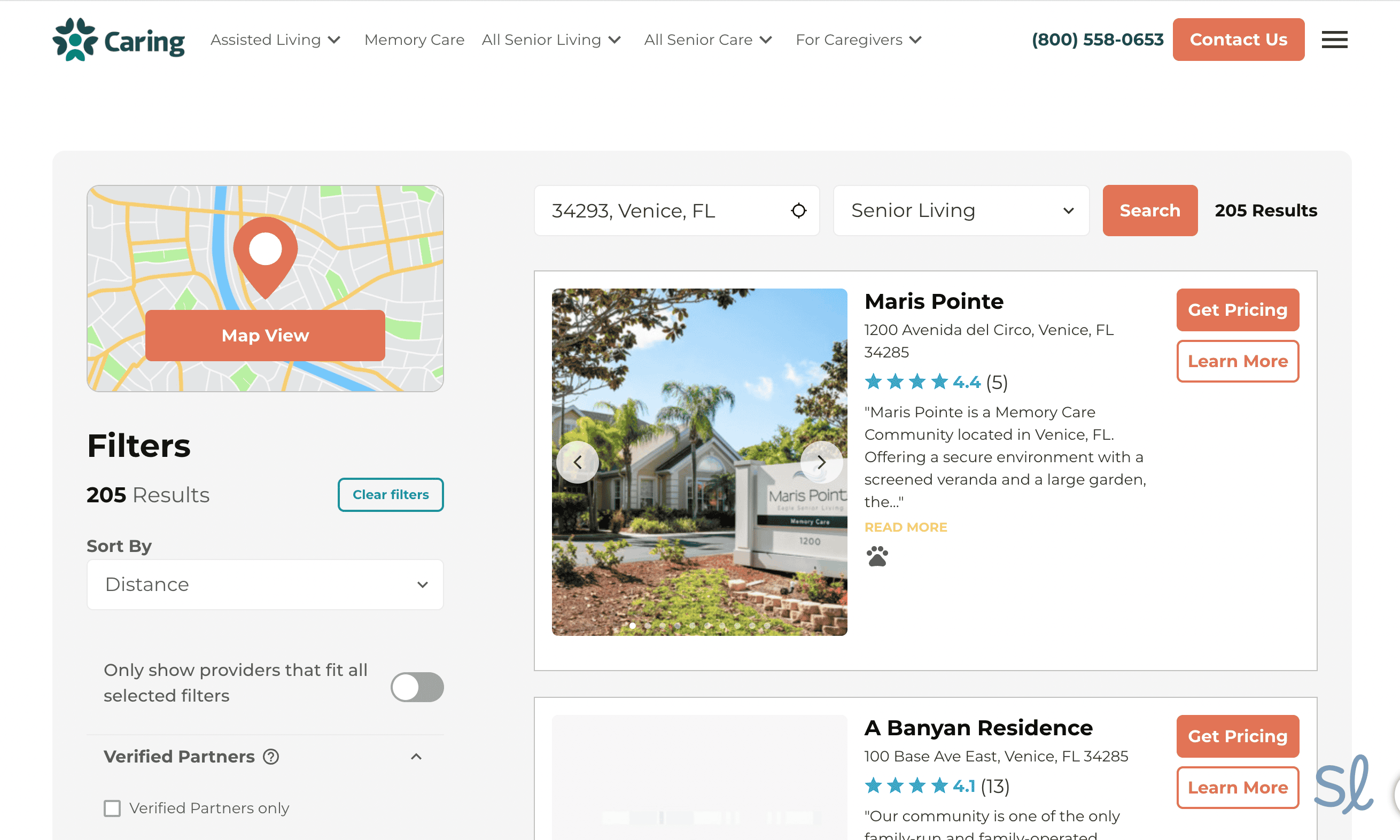 Using Caring.com was easy; I just began on the home page. In this day and age, when it can be difficult to reach real customer service people by phone, I love that the phone number is listed right on the home page. I also appreciated that I could talk to a Caring Family Advisor, if I wanted to, by calling that 1-800 number. I wanted to find information about assisted living facilities near me in Venice, Florida, so I typed in my ZIP code. I quickly received the results.