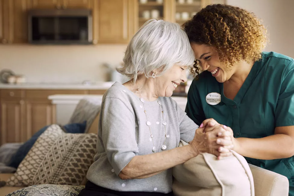 An Oakmont care provider spends time with a resident; Source: Memory Care | Sacramento Retirement | Oakmont of East Sacramento (oakmontseniorliving.com)