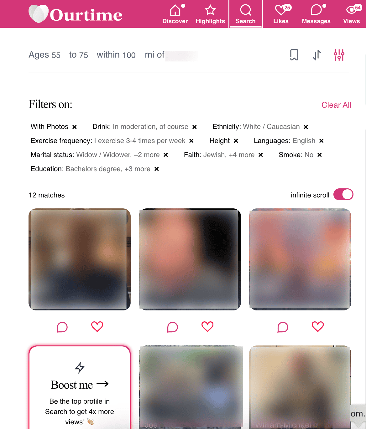 One of our favorite mature online dating sites, OurTime seems effortless to operate. Their search capabilities set them apart. You’ll be able to use many filters while searching, so you can focus on your priorities for a match. And you can find prospects under mutual search, reverse search and even saved search. They also have live events in various cities