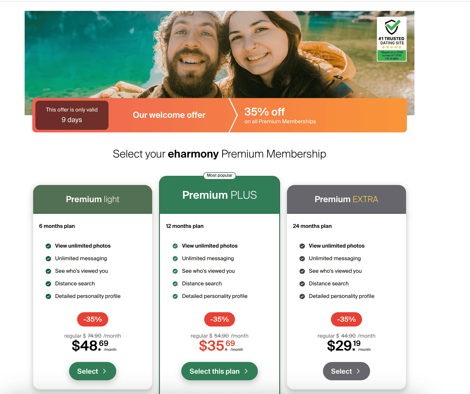 Viewing eHarmony's Premium membership options