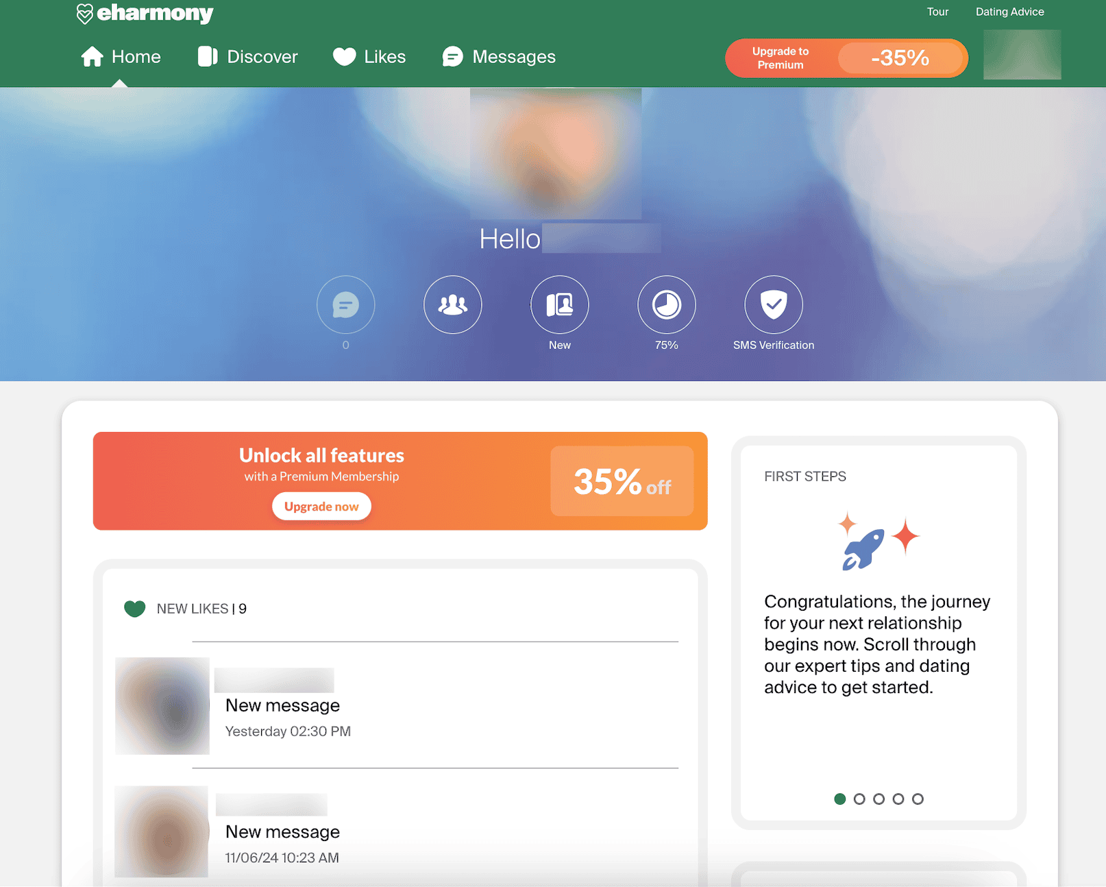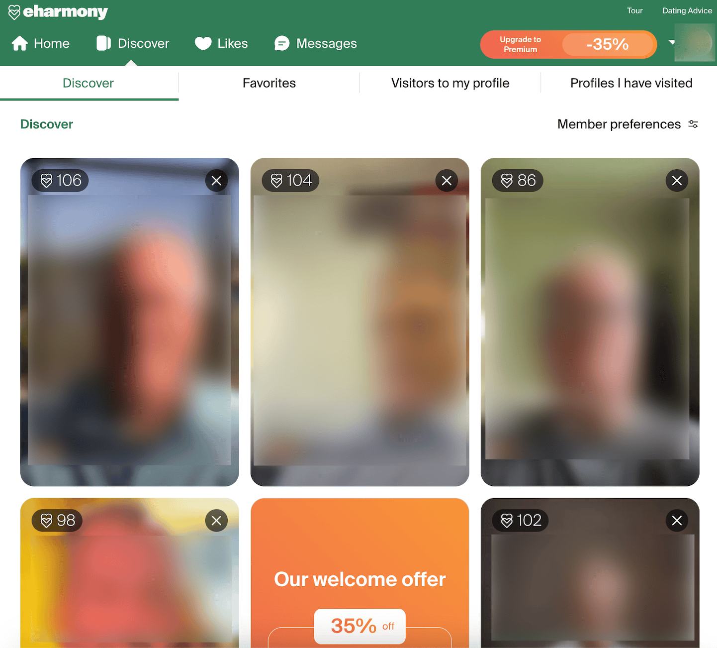 eHarmony’s Basic membership is free, and you don’t need to give credit card information. With a Basic plan, we could read profiles (with blurred-out photos) and browse matches. We could also send and receive likes, but not communicate with full messages. Like most sites, Premium membership unlocks many features and better enables you to interact with others.