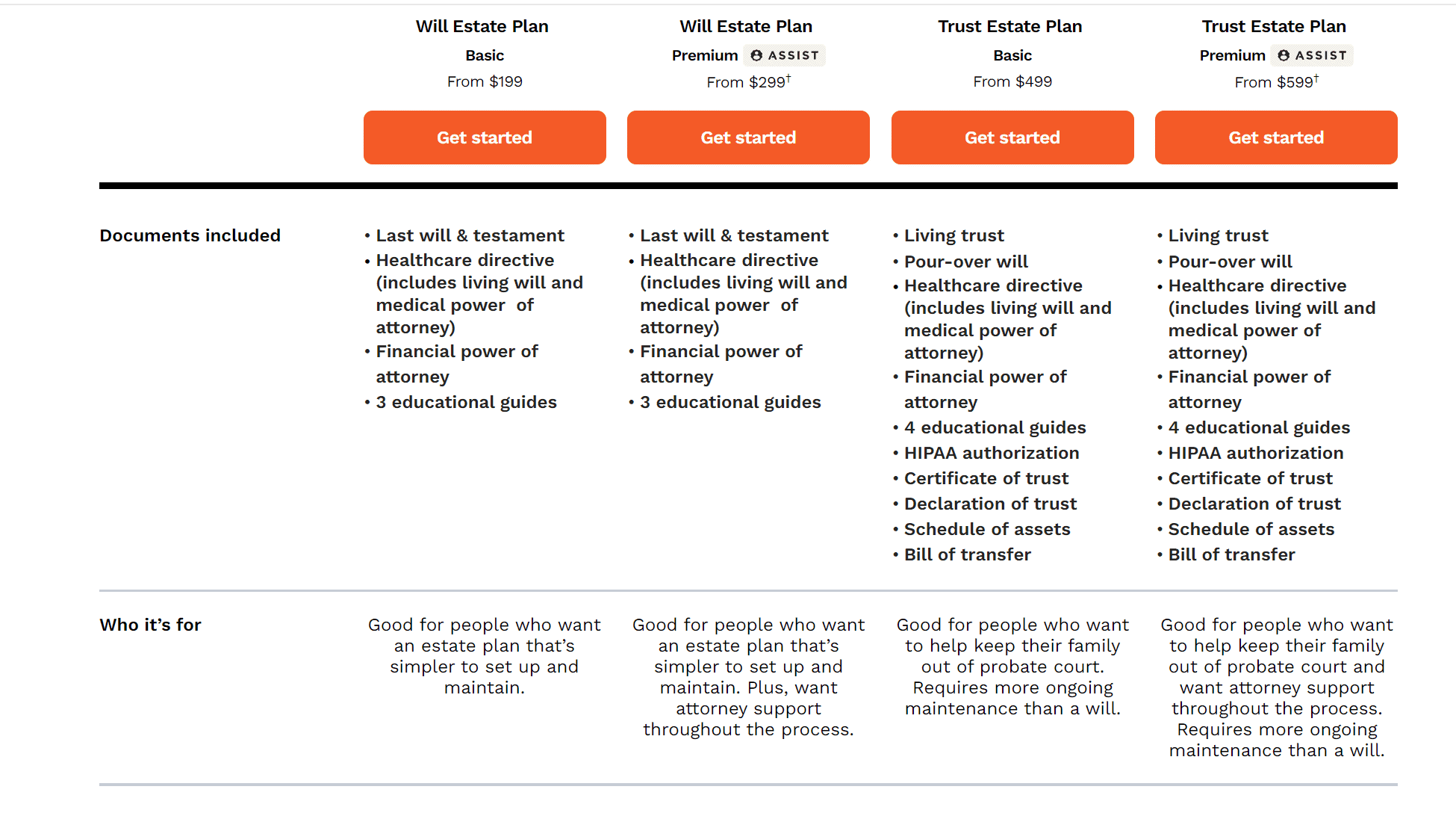| LegalZoom | $99 to $649 per year and up | Will, living will, and medical power of attorney, plus trust documents | Yes | Plans include the first set of document printing and shipping |