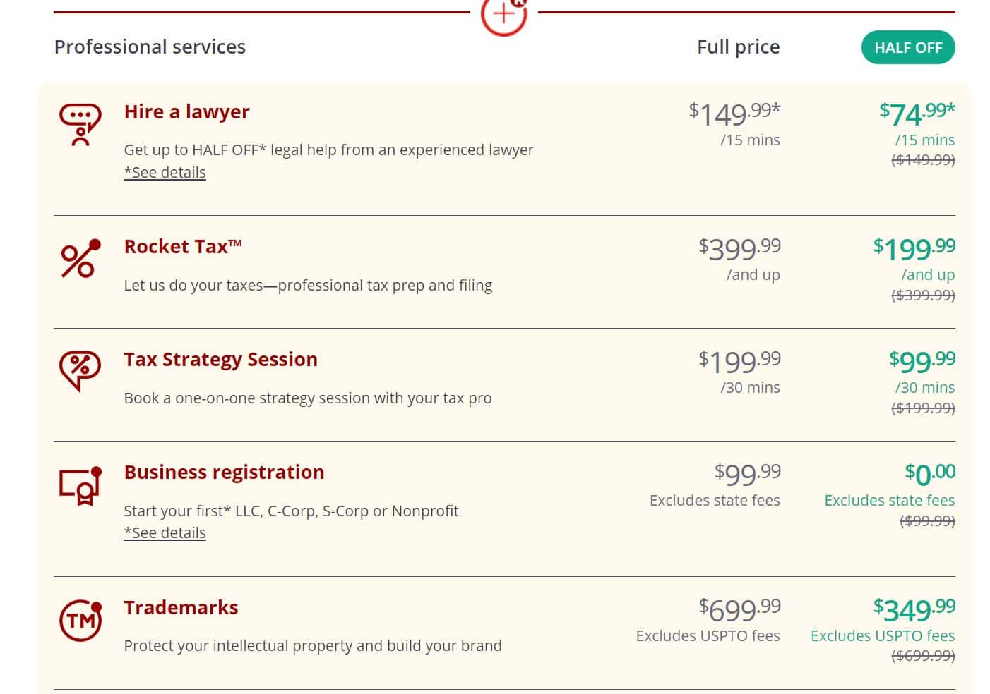 - Rocket Legal+: Costs $19.99 per month, billed annually at $239.88. There’s also a seven-day free trial available. Rocket Legal+ includes the same services and documents that Rocket Legal offers. However, hiring a lawyer costs just $74.99 for 15 minutes with this plan. Other services, like tax strategy sessions, are also discounted compared to the Rocket Legal plan.