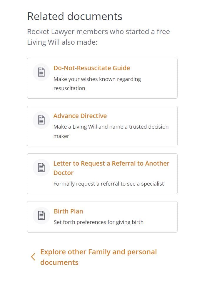 While a Rocket Lawyer membership gives you access to many documents, they aren’t very well-organized, so it can be difficult to see the value of a membership. We had to hunt around on the website to find different will documents, but once we opened a document page, related document suggestions were displayed on the side. Those suggestions made it easier to find additional documents that could be helpful.