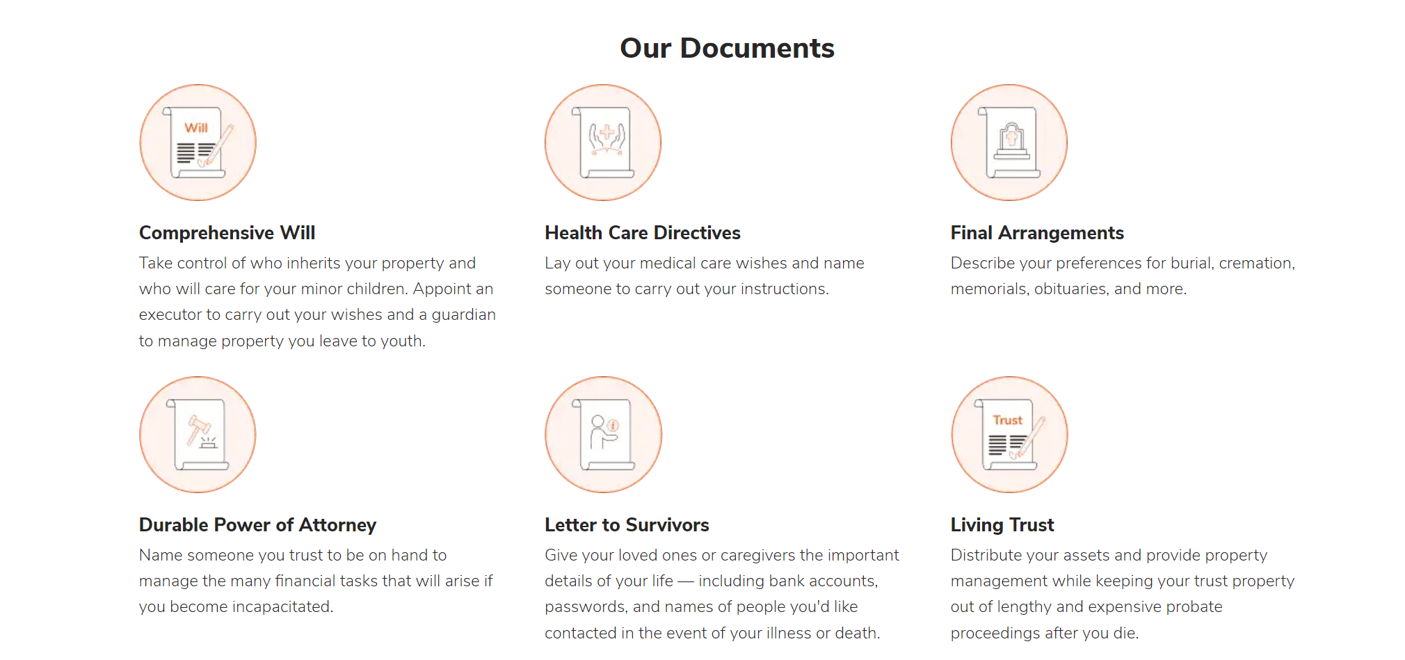 - Types of documents: We started by reviewing the types of documents that each platform supports. We looked for wills at a minimum, but also chose platforms that offered other documents like power of attorney and living wills.
