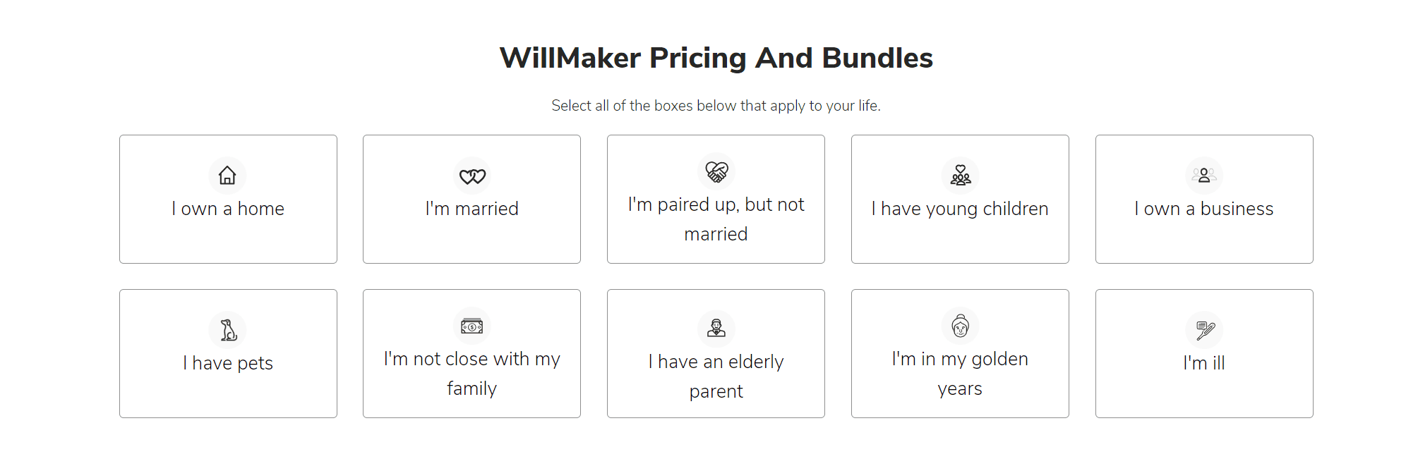 Unlike LegalZoom, Duckpins doesn’t offer differing packages for wills and trusts. If you’re not sure which you need, Duckpins will supply you with a list of questions to help you figure out which document type is best for you. No matter which one you choose, your cost will be the same.
