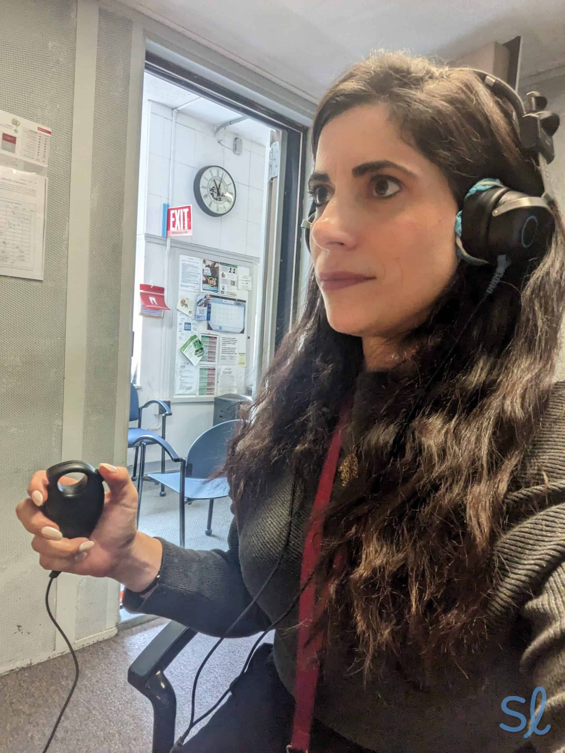 Audiologist Dr. Ruth Reisman demonstrates taking a hearing evaluation