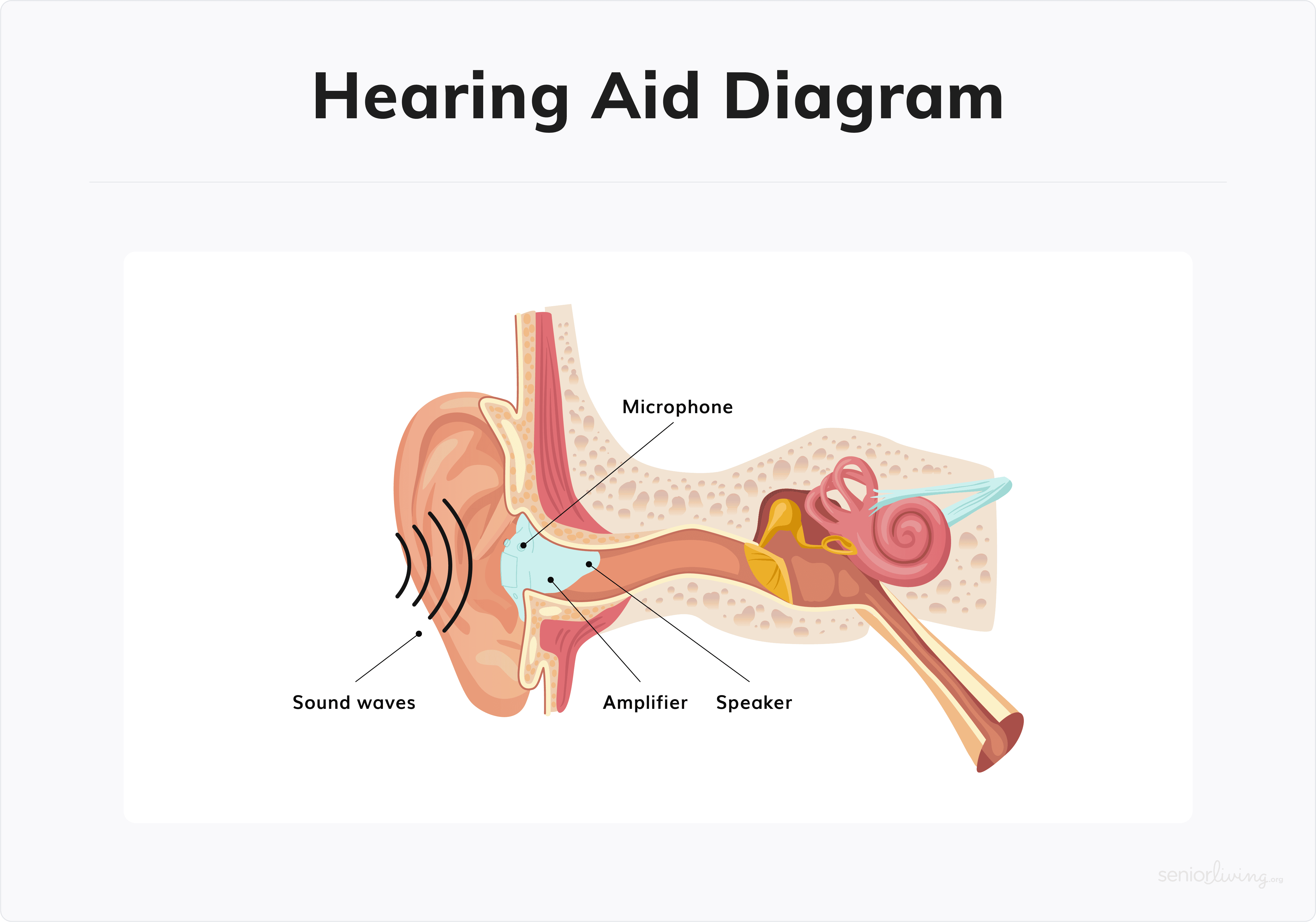 Hearing aid technology is constantly changing and improving. But in general, most hearing aids work similarly. When you wear a hearing aid, sound vibrations enter the ear and travel into the ear canal. These vibrations continue to travel through the eardrum and the small bones of the middle ear and into the inner ear. That's where the sound is processed and sent to the brain.1