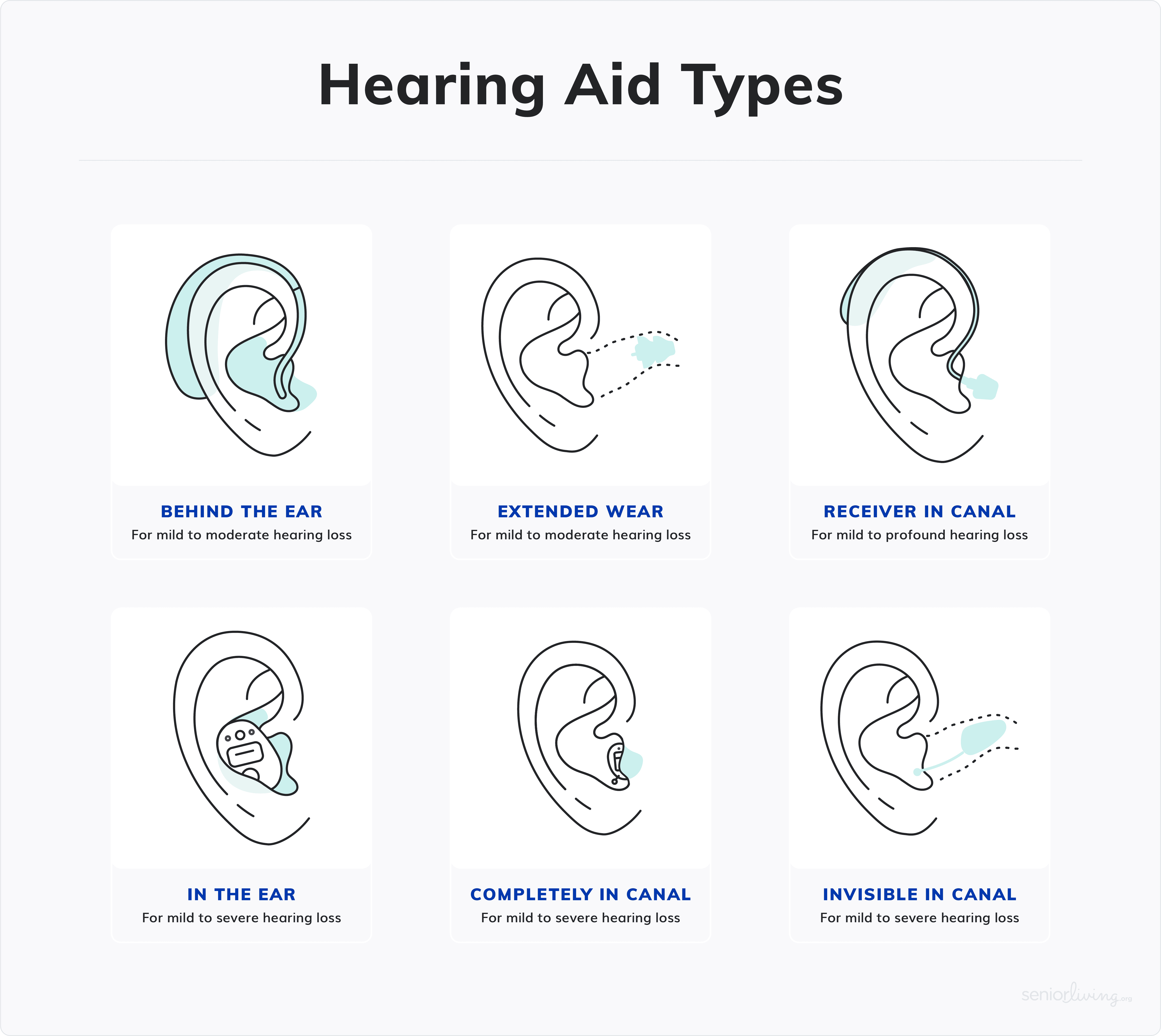 Now that you have some general knowledge about the hearing aid types from the previous section. Take a moment to check out this video on the Types of Hearing Aids from the Senior Living YouTube Channel. In this video, we cover all of the major hearing aid types, how they work, and some of their functionalities. Hear all of this information directly from our resident audiologist Brad Ingrao, Au.D.