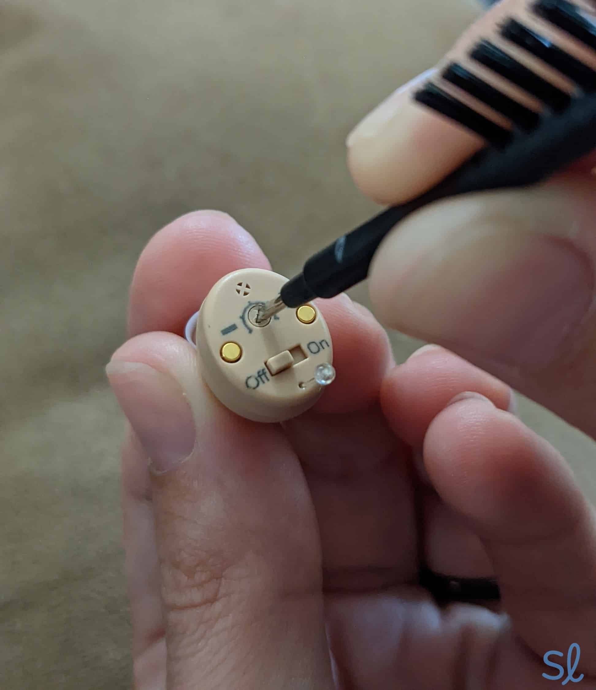 Using the brush/screwdriver combo tool to adjust the volume on the Atom hearing aid.