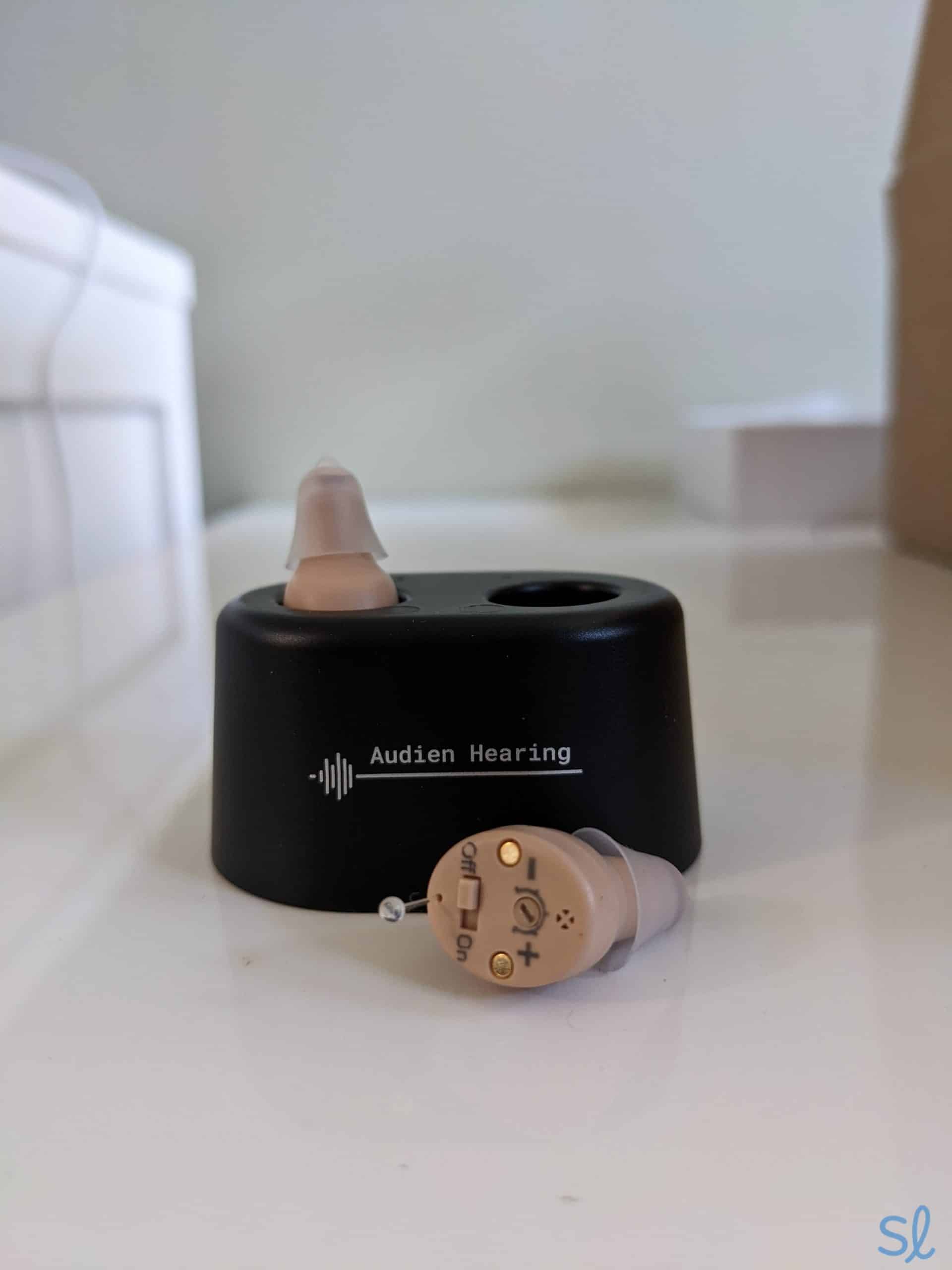 The Audien Atom is an ITE hearing aid that’s 22 percent smaller than its predecessor, the EV1. It uses Audien’s new Atom sound technology to deliver better amplification for wearers. Other features include a 24-hour battery life and a wireless charger. I also liked that this hearing aid has an on/off switch. That makes preserving battery life a bit easier. Plus, you can wait until the devices are in your ears to turn them on. This prevents the static whining noise that I noticed these hearing aids emitted when handled.