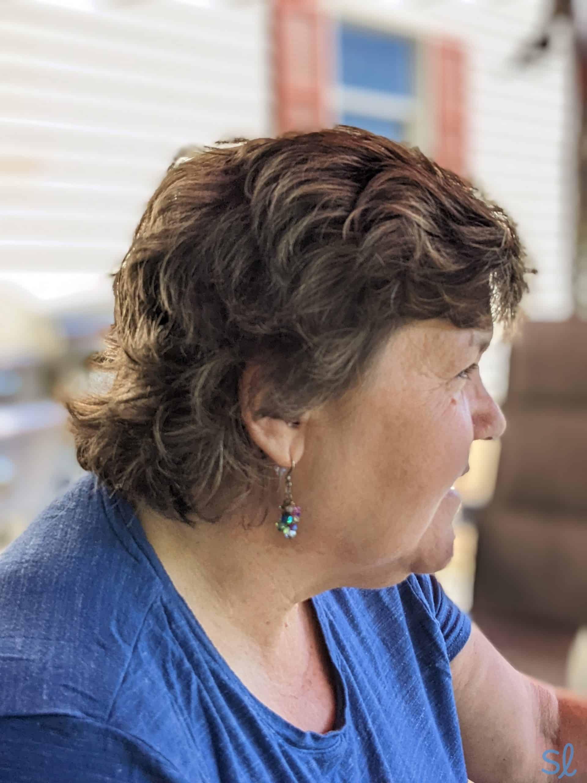 Sarah’s mom wearing the Audien Atom hearing aids.