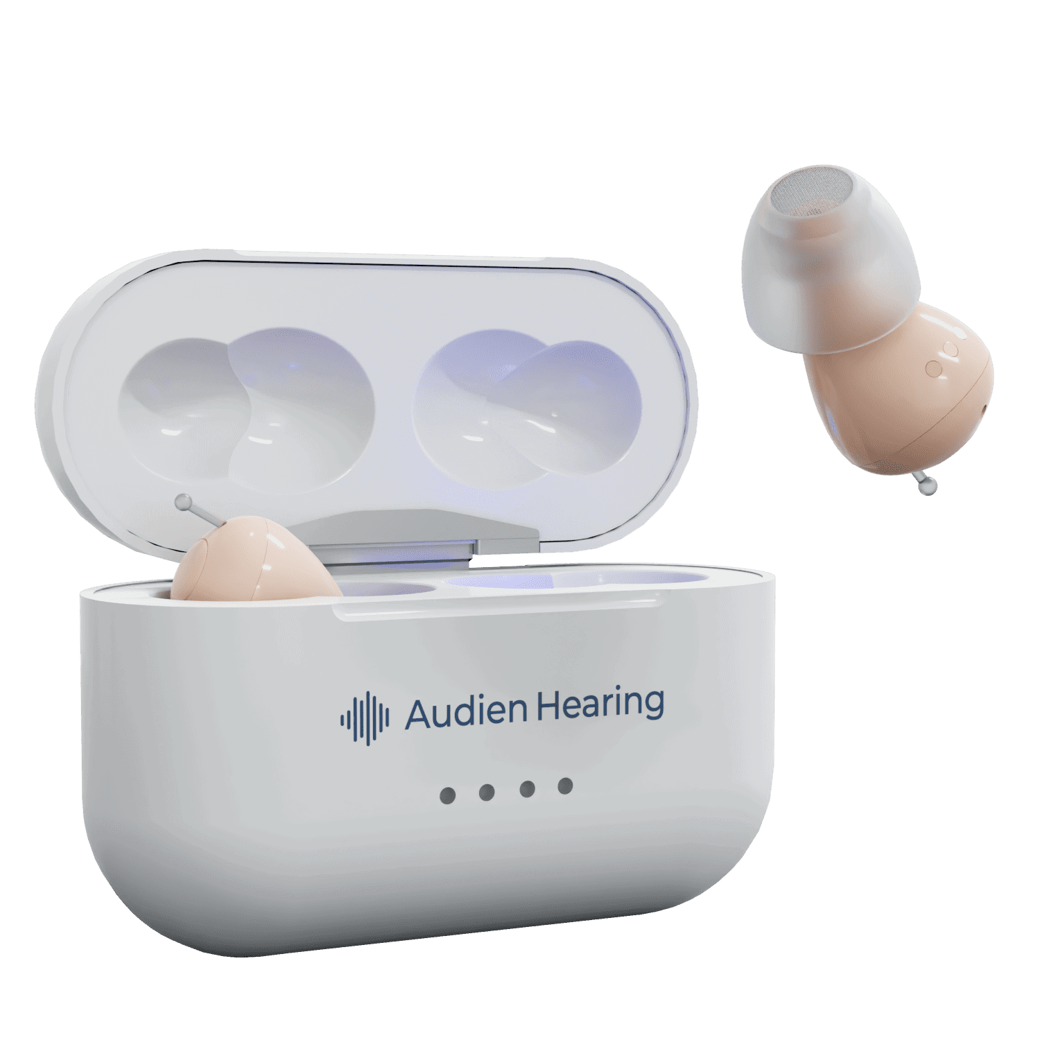 Audien Atom hearing aids inside and outside of the charging dock.