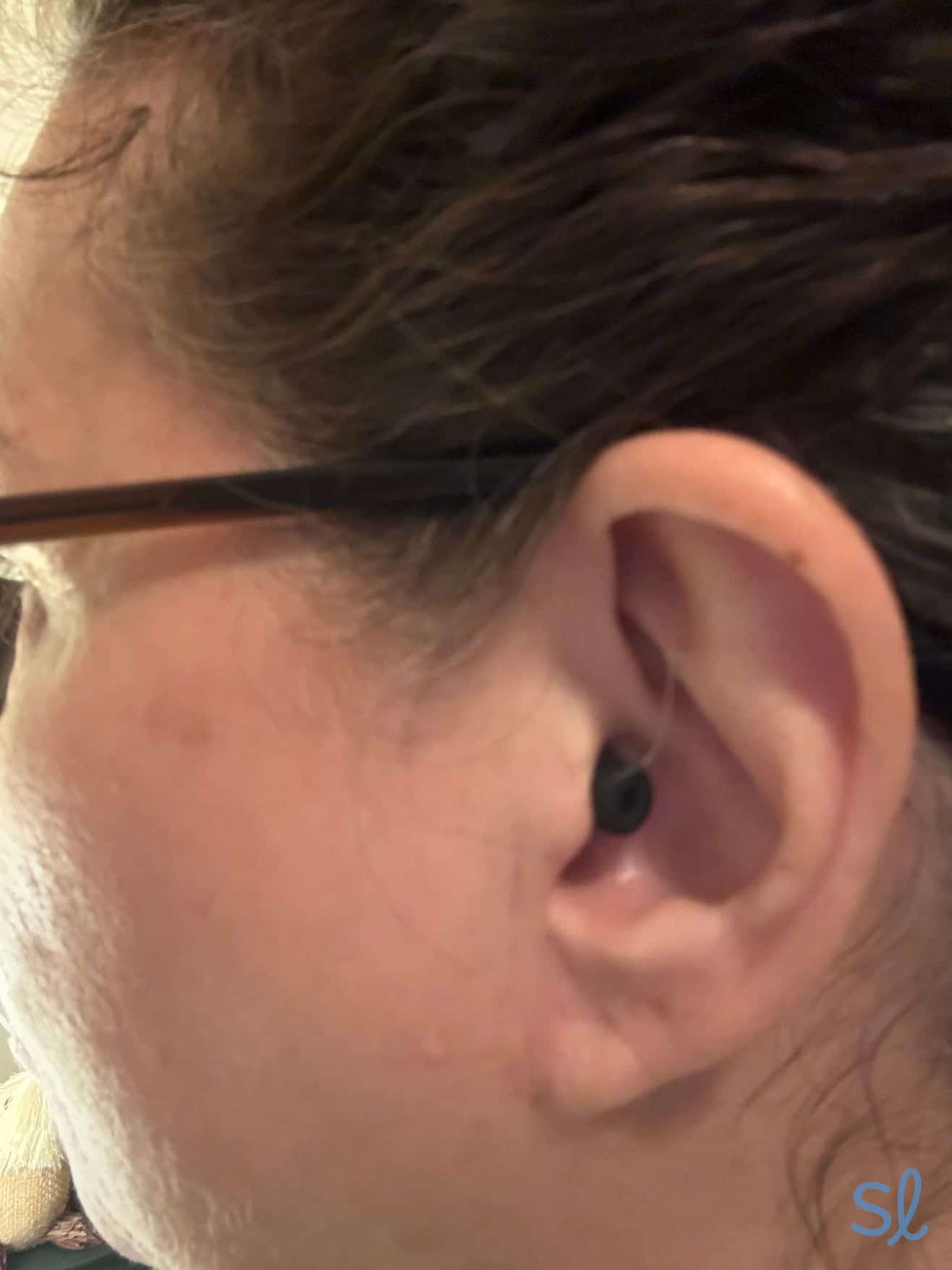 One of our testers wearing LINK by Eargo hearing aids