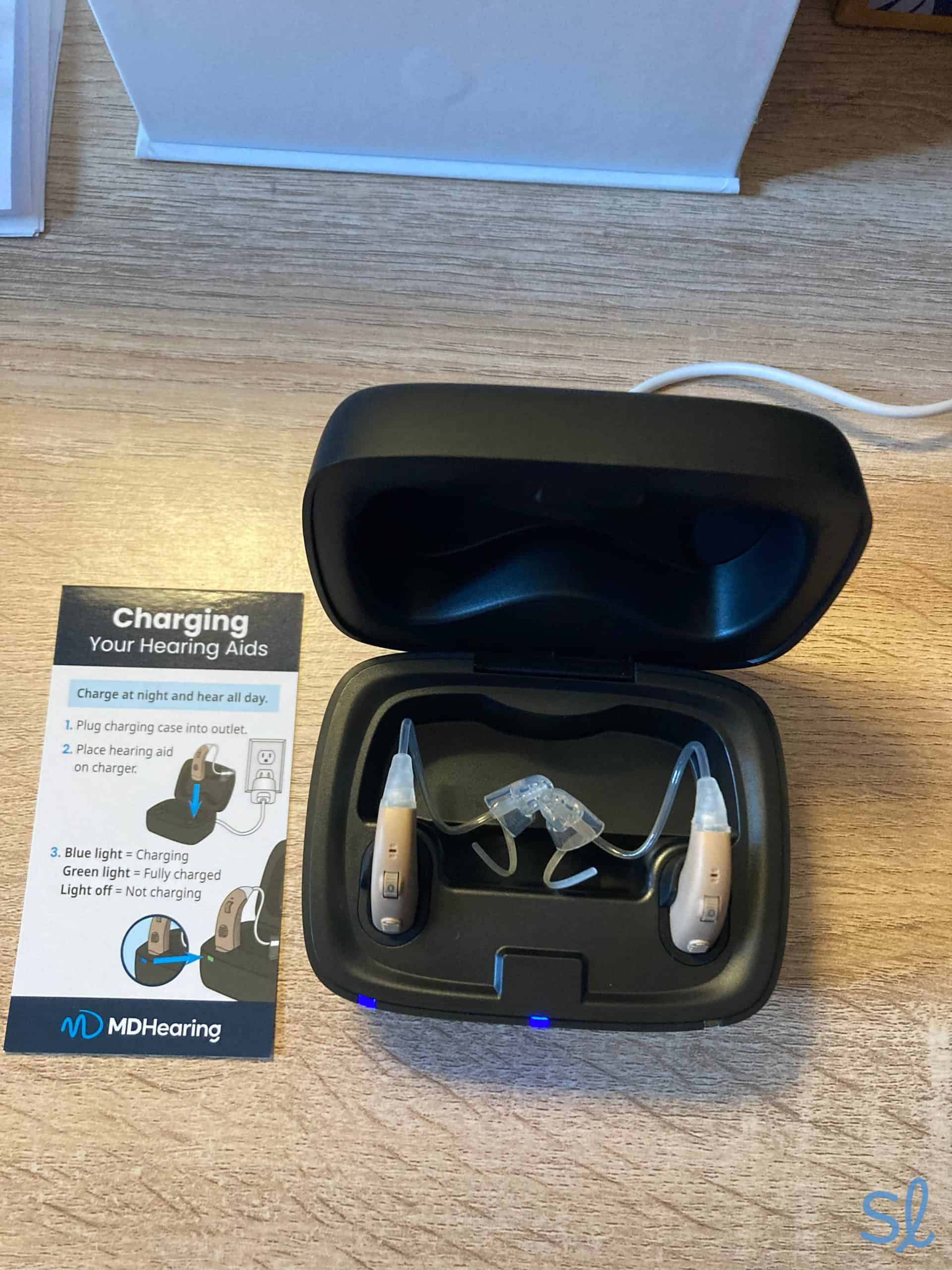 My hearing aids charged fully in 1.5 hours. One of the three blue dots remained blue instead of turning green at the 1.5 hour mark. I didn’t know if that meant the hearing aids weren’t charged fully, as this wasn’t explained in the manual. So, I kept the case plugged in for another hour just to be on the safe side, but the lights remained the same — two green and one blue.