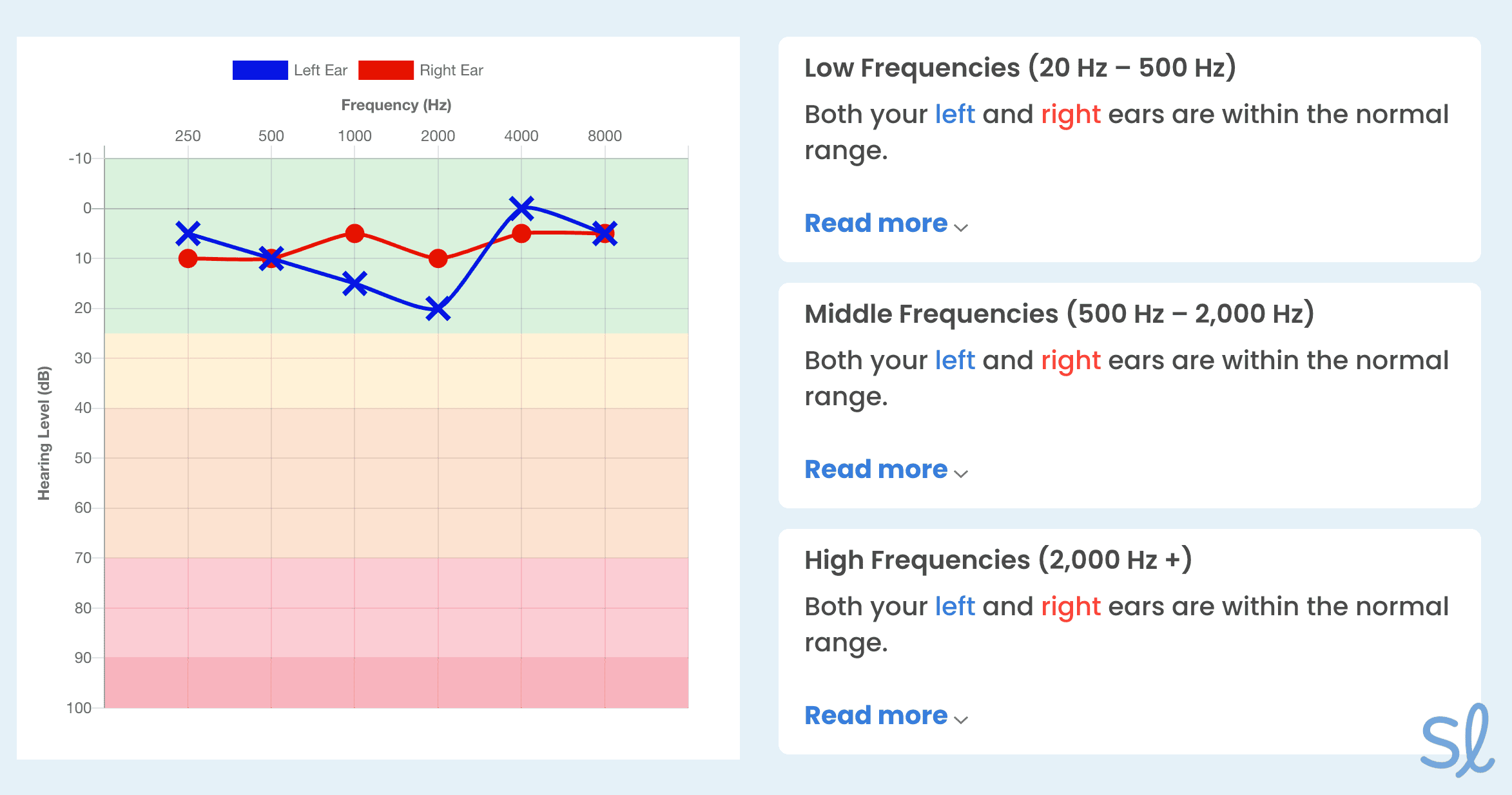 During the test, six sounds are played in each ear along low, middle, and high frequencies. The isolated frequencies help to identify the frequencies you’re having trouble hearing. This information is pivotal in determining what hearing aid will be best for you. Your easy-to-read results will be available in a thermometer format, as shown above, and as an audiogram: