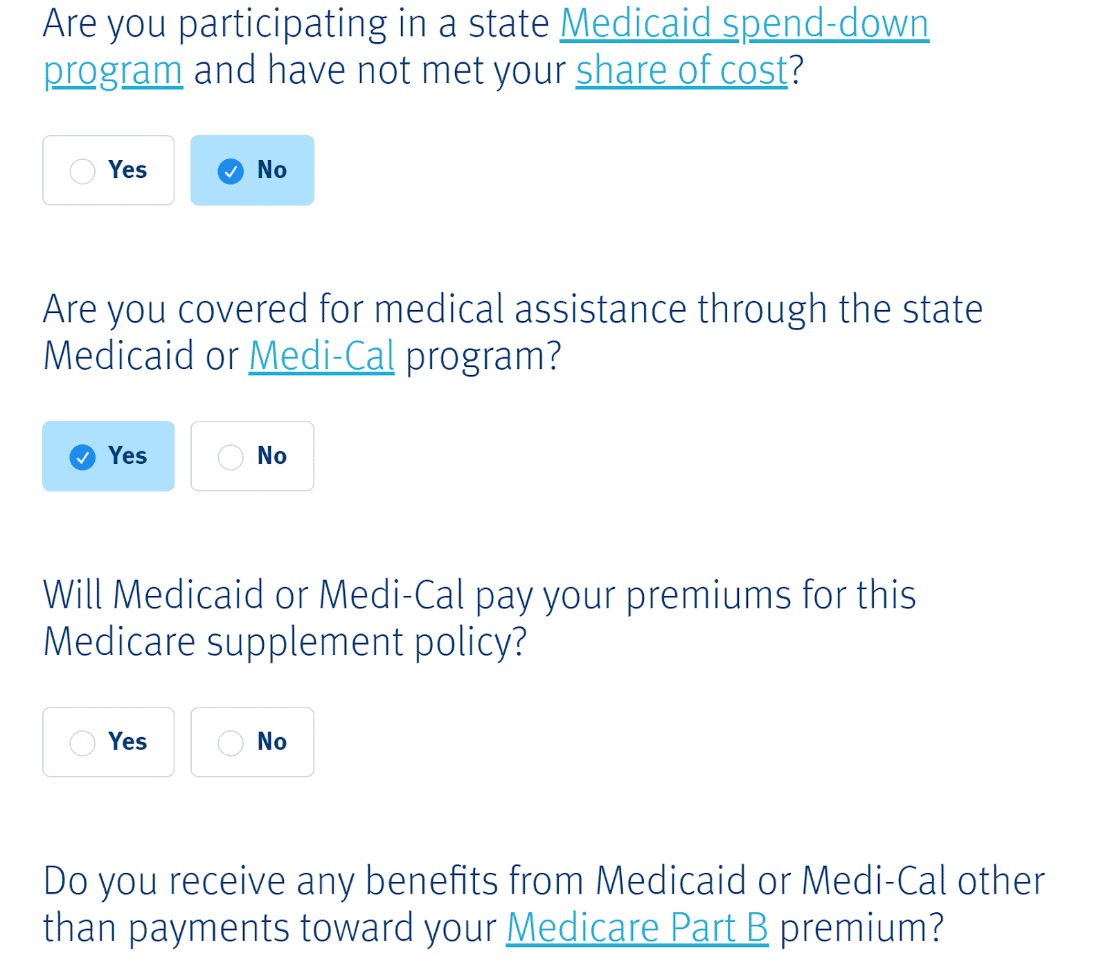 - Answer the health questions. (You can skip these if you’re in your open enrollment or guaranteed issue period.)