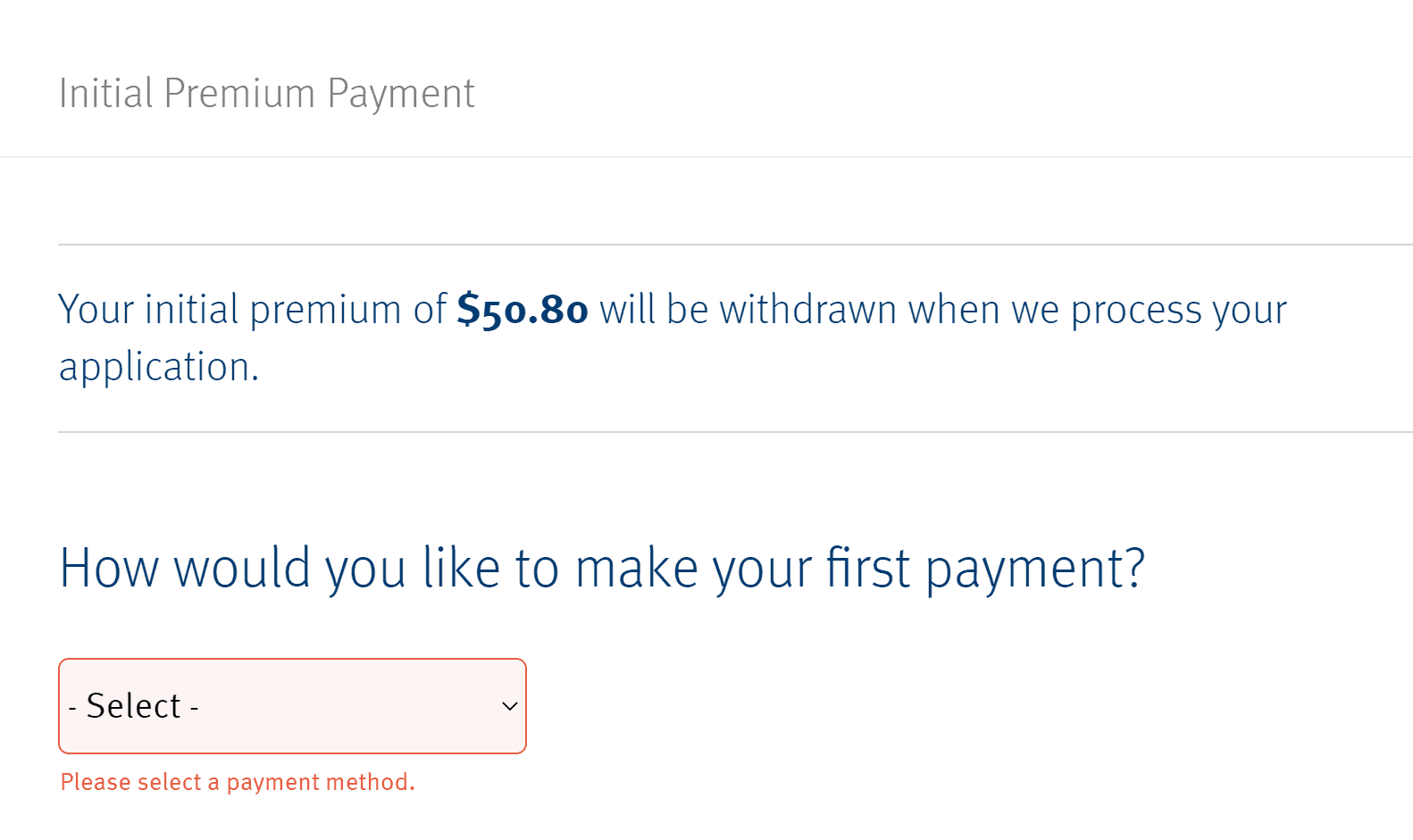 - Make your payment and billing selections. Your initial premium quote will be withdrawn once your application is approved and processed: