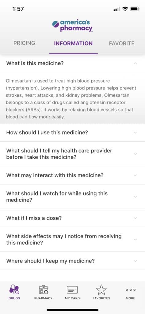 Just like the America’s Pharmacy website, you can search the app for prescription medications to find the best prices at a pharmacy near you. You can toggle between the list and map views to see where each pharmacy is located. Once you select a coupon for the pharmacy of your choosing, all you have to do is show them the coupon or your discount card on your smartphone to receive the discounted price at checkout. You can also get answers to frequently asked questions about your specific medication.