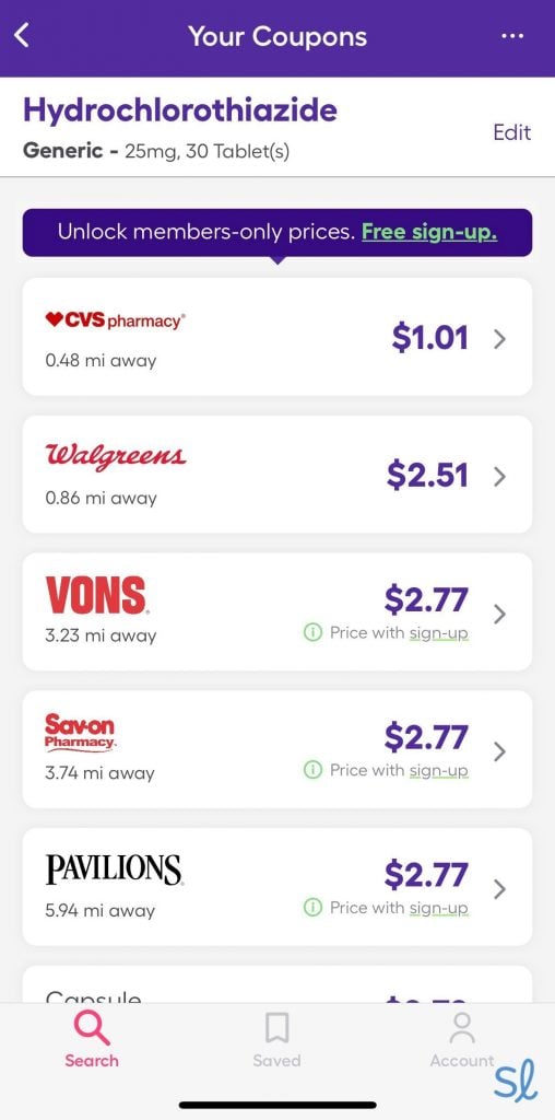 We can’t complain about savings with SingleCare. We tested the service on hydrochlorothiazide (also known as Microzide), a common medication used for high blood pressure. When we searched for the medication on SingleCare’s website, we found savings at participating pharmacies that ranged from about 85 percent to 99 percent. That means we had to pay only 1 percent of the retail price when we presented our SingleCare card at checkout!