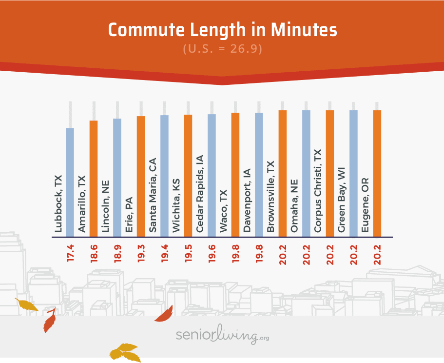 The length in minutes of the average person's commute was based on information published by the U.S. Census Bureau for cities and the nation.