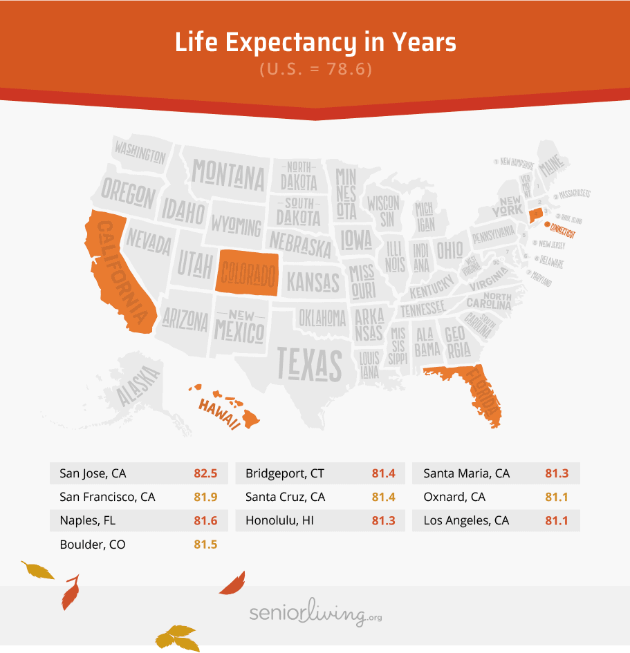 This information was calculated by taking the from-birth male/female average life expectancy published in a CDC dataset that can be found here. Notably, information for Maine and Wisconsin was not available. For cities in those states, the state-level life expectancy numbers were substituted. Overall U.S. life expectancy, according to the CDC, is 76.4 years.