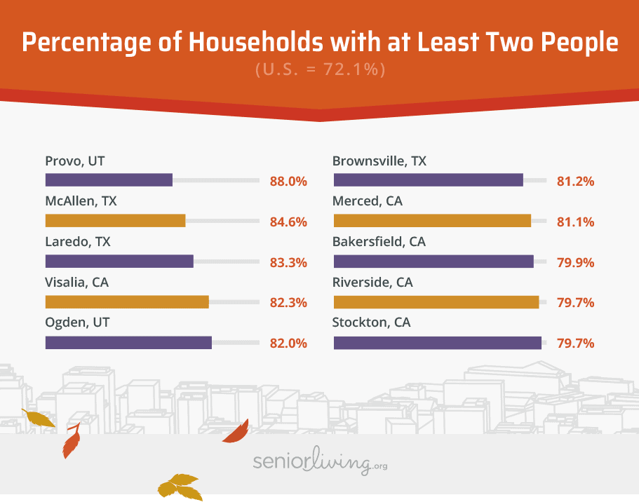 We used data from the U.S. Census Bureau on the percentage of households with more than one person. City-level data came from a custom Census table, and the national figure is here.