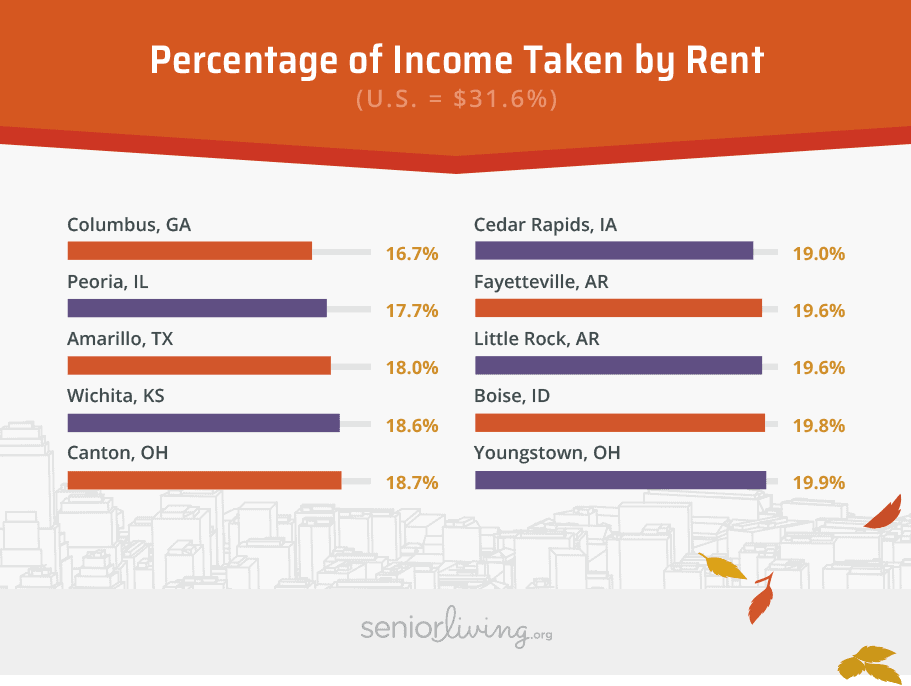 This metric is based on the amount of household income eaten up by the annualized average rent amount in each city, which we calculated using monthly rent data from Zillow.