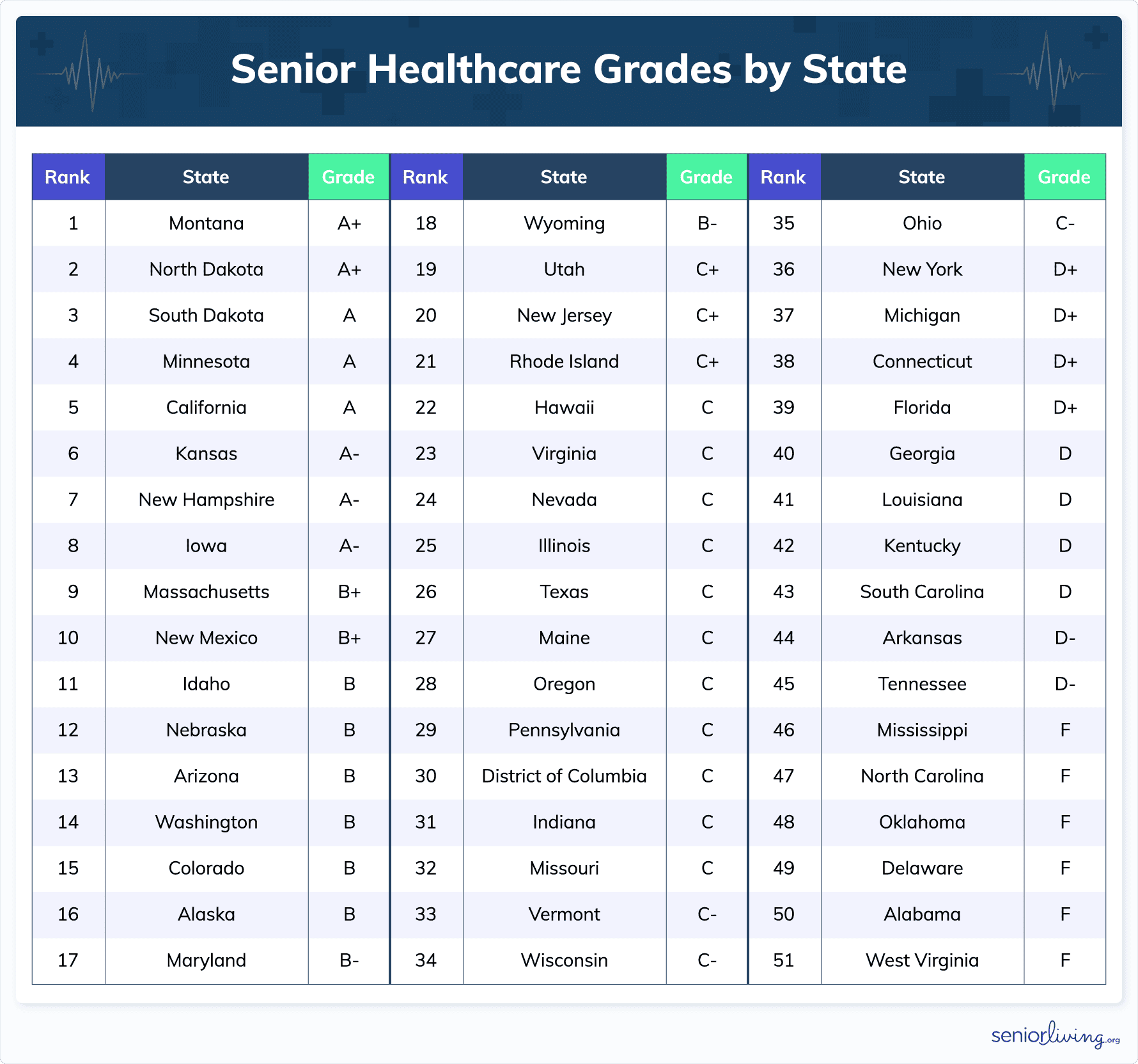 Below is a report card on every state's overall senior healthcare status. Grades were derived from a composite ranking of each state’s performance across several categories: healthcare accessibility, costs, and outcomes for those aged 65+ (the methodology is detailed below).
