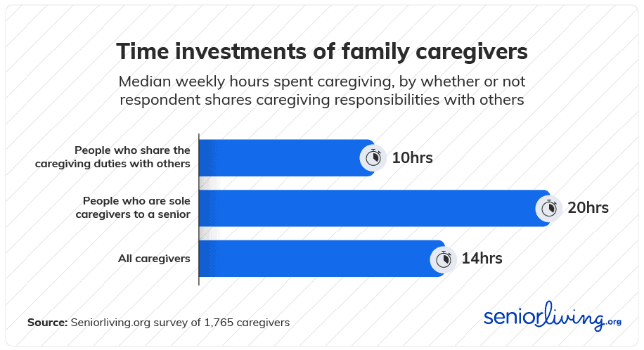 The burden is much more significant for sole caregivers than those who share the responsibilities, and many caregivers are balancing work and care responsibilities. Our survey found that sole caregivers typically spend 20 hours per week on caregiving, double the 10 hours spent by those with shared caregiver duties.