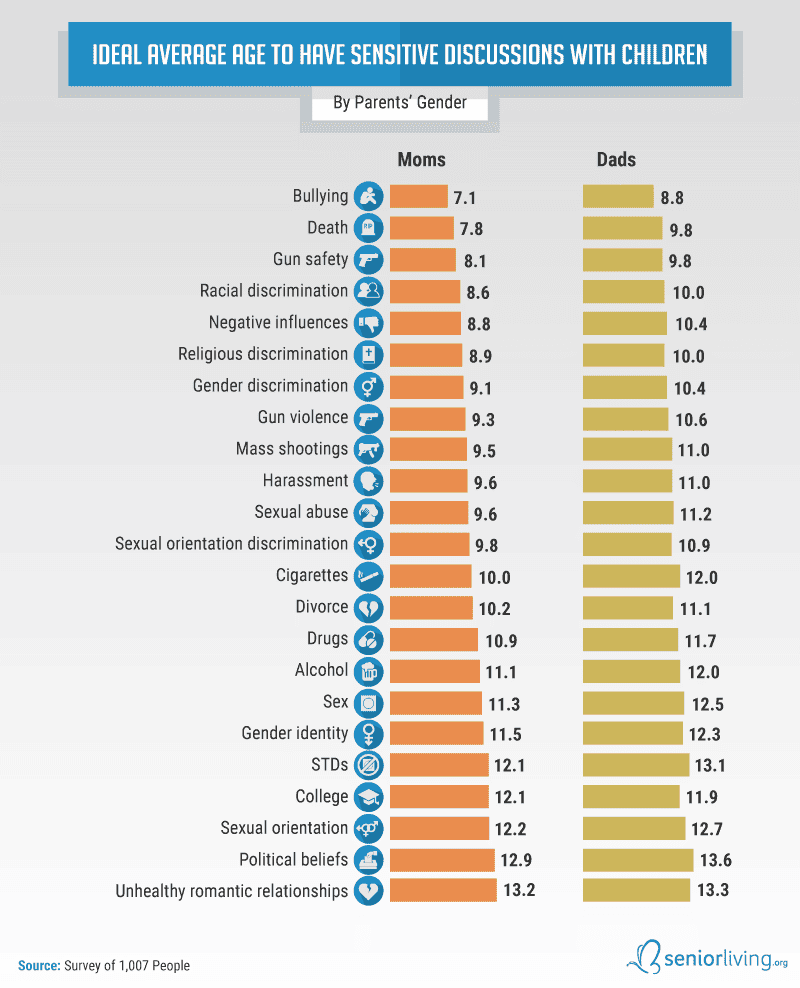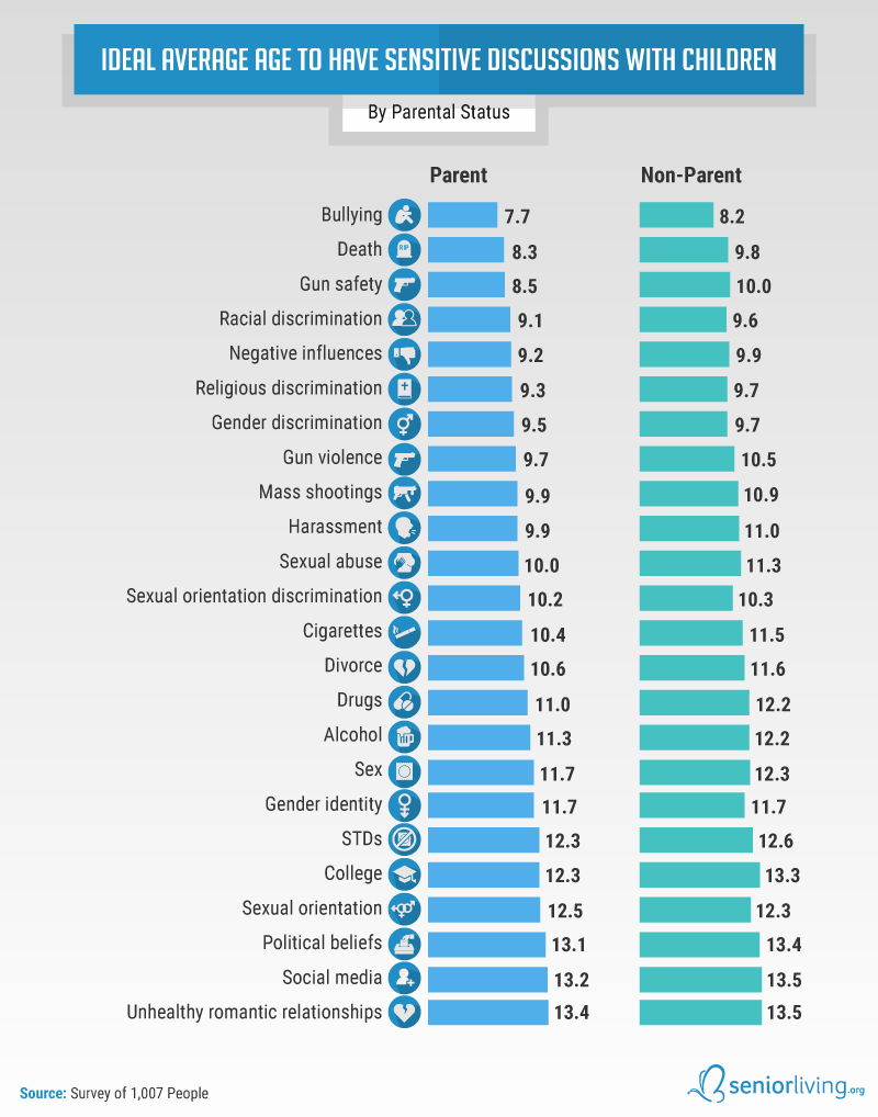 We surveyed 1,007 people to find out which ages they associate with a variety of challenging issues, the sensitive topics being discussed most frequently, and how gender and generational divides play a role in what parents see as acceptable behavior for their kids. Continue reading to see what we learned.