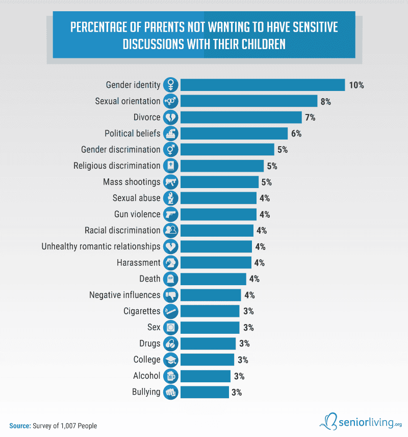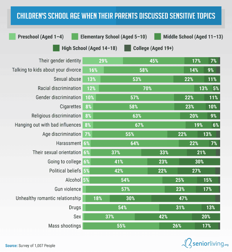 Some topics creep up earlier in life than others. Take gender identity, for instance. Twenty-nine percent of parents who’ve had a conversation about gender identity with their child did so before the child turned 5. Sixty-four percent of parents spoke to their kids about harassment when they were in elementary school, and 20 percent of parents waited until high school to talk about sex.