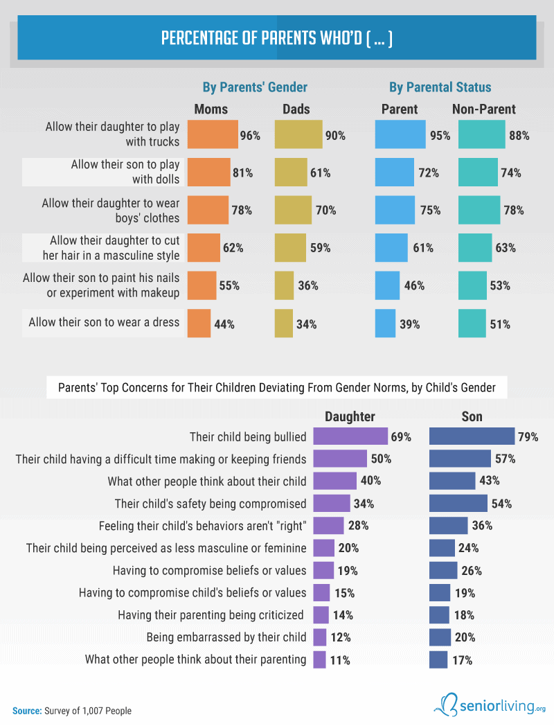 Bullying was the biggest concern for parents when it came to having a child deviating from gender norms, with 69 percent worried about their daughters getting bullied, compared to 79 percent worried about their sons. While parents’ concerns hardly varied depending on their child’s gender, they were more worried about their sons’ safety being compromised – a potential indicator that parents fear boys being more violent, especially given children’s tendency to group by gender at a young age.