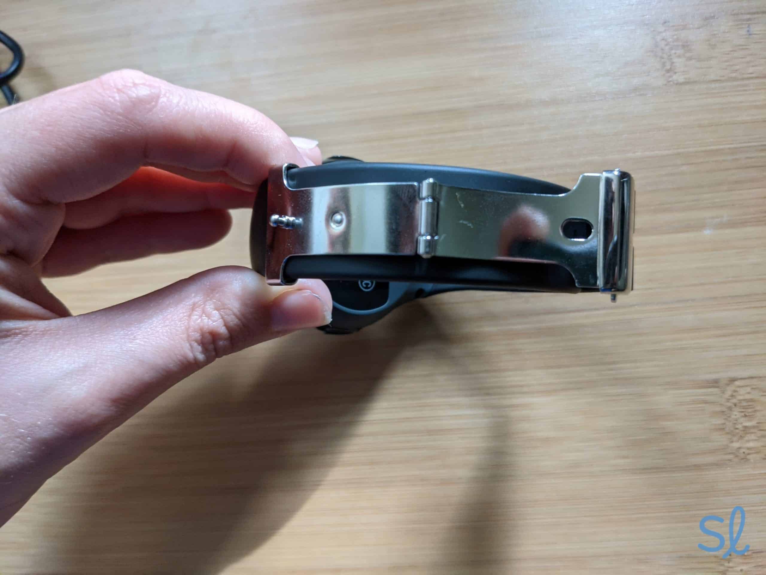 I really like this smartwatch’s band. It’s made of thick, durable rubber with adjustable holes for sizing. The metal pin that clicks into these holes is much easier to press into place without applying lots of pressure.