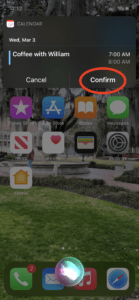 - Next, you’ll need to say, “Confirm,” or tap “Confirm” to add it to your schedule.