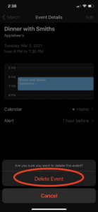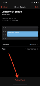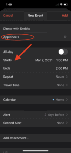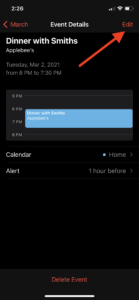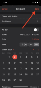 - From here, you can edit the time, title, location, and alerts for the event. Don’t forget to tap “Done” in the top-right corner to save your changes!