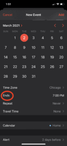 - When you’re done with that, scroll down and tap “Ends” if you would like to include an end time. Use your keyboard to type in the end time.