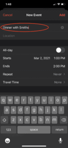 - Tap the top box to type in the title of the event. This could be a meeting, appointment, event, etc.